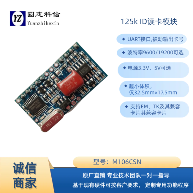 • M106BXN非接觸ID卡射頻讀卡模塊采用125K射頻基站,為圓志公司新一代ID卡讀卡模塊