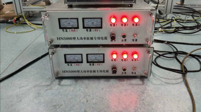 使用前必須把控制電箱牢固接地,高壓箱地線與滾筒鐵架相連接。靜電機用架子放好,與滾筒鐵架保持距離50公分以上,以免高低壓相互干擾。靜電駐極機周邊設備應接地良好。 靜電機分控制電箱和高壓輸出電箱兩部分。控制電箱接地線??!,高壓箱地線接上滾筒鐵架與地線相通。 靜電機放好后用5芯數(shù)據(jù)線把控制電箱和高壓輸出電箱連接。 (航空插頭與插座有個缺口,對上缺口插上旋上羅母固定)