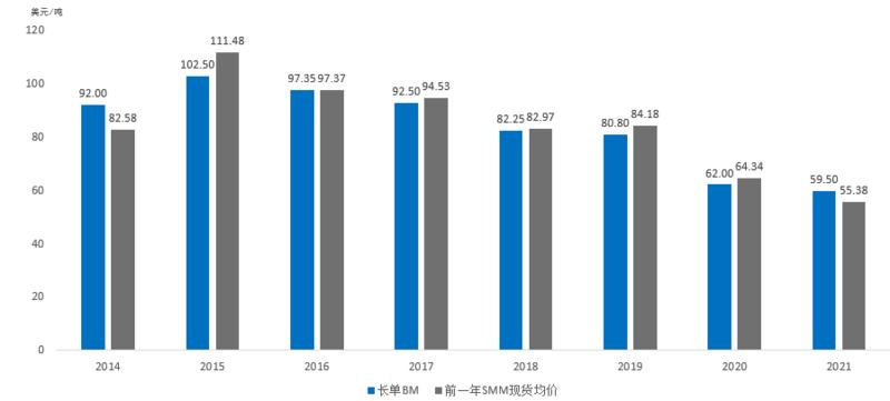 歷年長(zhǎng)單加工費(fèi)Benchmark與前一年SMM銅精礦TC現(xiàn)貨均價(jià)對(duì)比