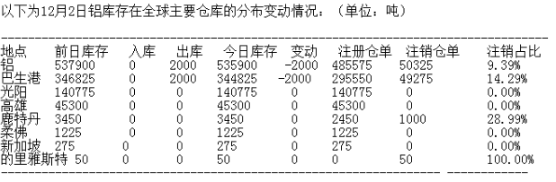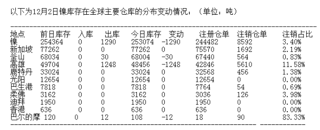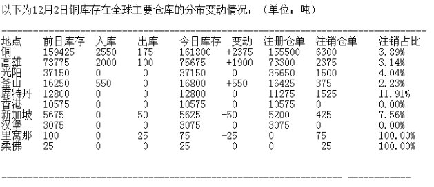 LME 12月2日有色金屬庫(kù)存分布情況