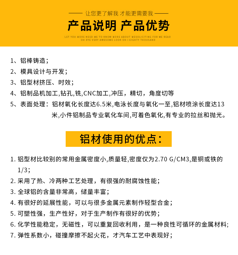 | 產(chǎn)品服務(wù): | 鋁型材模具 鋁型材表面處理 擠壓鋁型材 鋁型材深加工 工業(yè)鋁型材 散熱器鋁型材 | ||