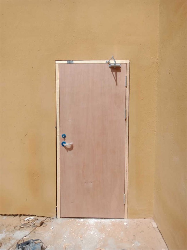 4)門框:如圖1C-C所示,柳桉木材固定于門洞墻體上,三層防火板及面板固定于柳桉木材上,形成門框整體。門框與門扇搭接的裁口處留有密封槽,鑲填防火密封條。密封條由不燃性材料制成,具有遇熱膨脹的特性,可以有效地起到防火隔熱作用。