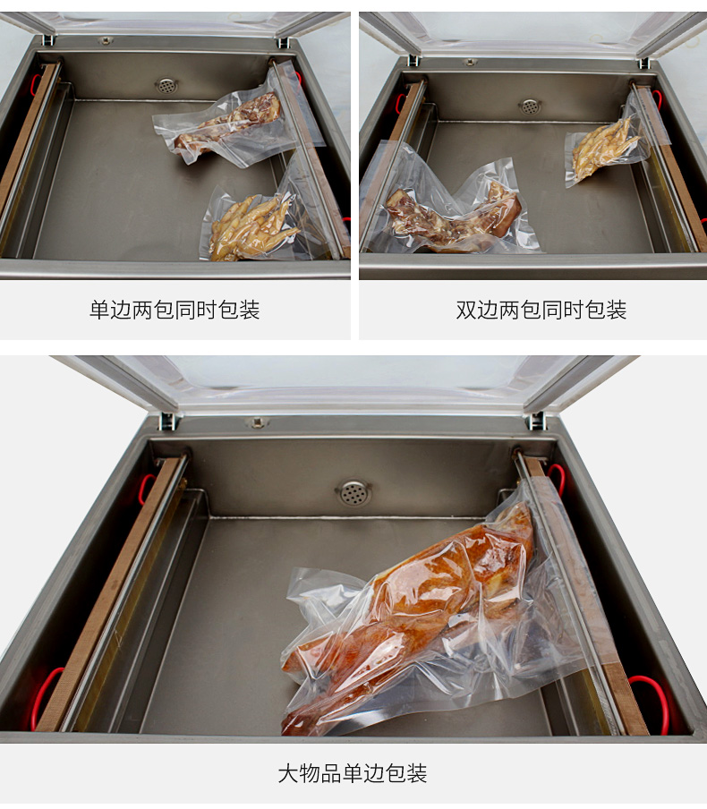 適用于食品、水產(chǎn)、化工原料、電子件、精密零件等產(chǎn)品的真空封口包裝。